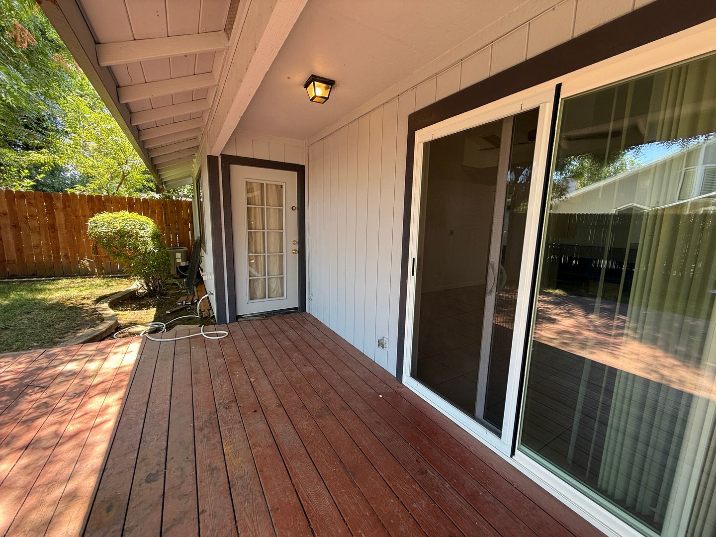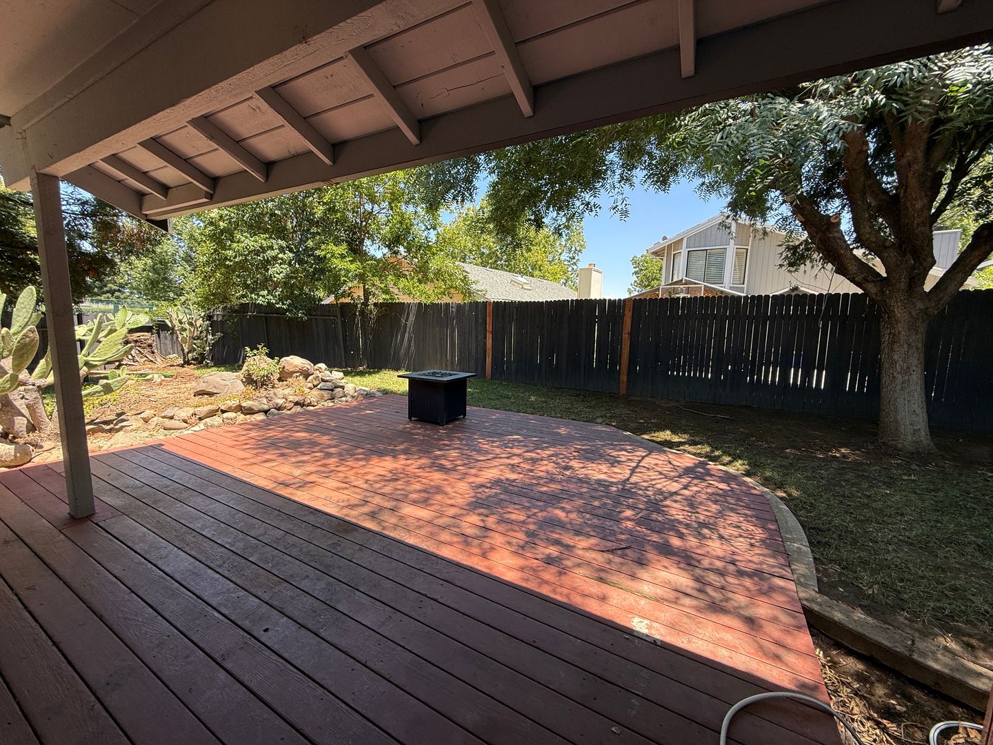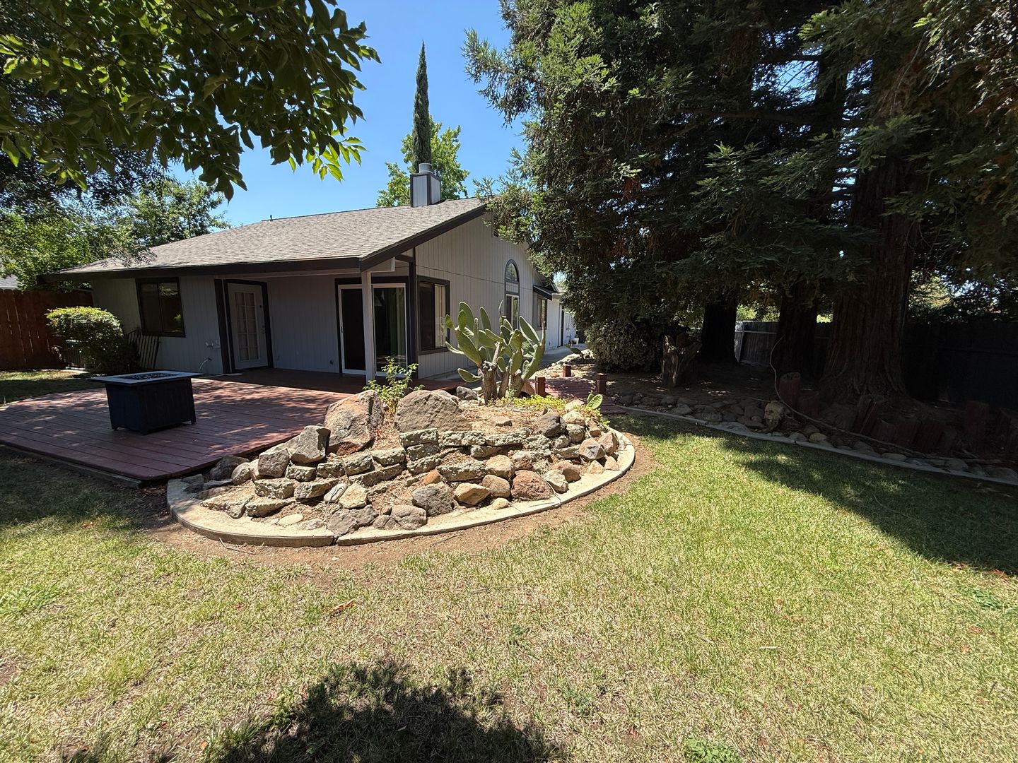 Welcome to this fantastic corner-lot home, ideally situated just across the street from Batey Park, which features three tennis courts and open green space. Inside, you'll love the spacious feel created by vaulted ceilings in the living room, complemented by a dual-sided fireplace that brings warmth and charm to both the family and dining areas. The kitchen boasts stunning granite countertops and stainless steel appliances, including a built-in microwave, induction range, and an 'as-is' refrigerator. Tile flooring throughout the kitchen, bathrooms, dining area, and living room helps keep the home cool during the summer months. The primary suite offers comfort and accessibility with two closets, a dual-sink vanity, grab bars near the toilet and in the walk-in shower, and direct access to the backyard—perfect for relaxing in your own private retreat. The attached two-car garage provides ample storage with built-in shelving and includes an 'as-is' washer and dryer. Step outside to a spacious backyard featuring a large deck, ideal for entertaining guests or enjoying peaceful evenings around the fire pit. Tenant is responsible for all utilities and landscaping. Renter's liability insurance required during tenancy. No co-signer, pets or smoking.